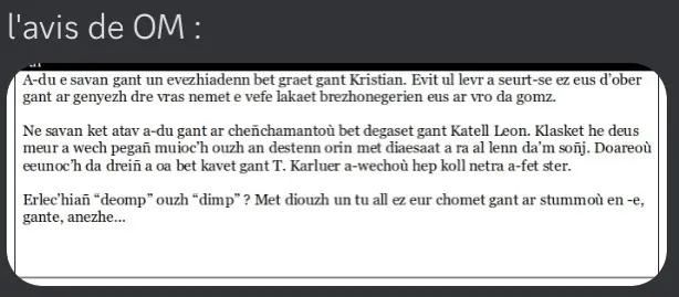 « Mat eo din pa vez afer gwellaat an doare da lâr an traoù pe da reizhañ fazioù gwir. Met n’on (n’emaon) ket a-du e vefe normalizet ar yezh betek re. Dieub a-walc’h eo ar vandenn-dreset e-keñver stummoù all. Brav e vefe pleustriñ gant ur yezh liesliv. Moaien zo implijout un doare “dre gomz” war tammoù zo. »