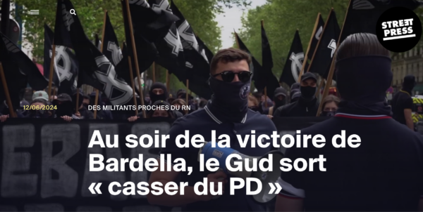 👨👩👧👦 Histoires de famille. À Paris, quelques heures après la victoire du Rassemblement national aux élections européennes du 9 juin, cinq jeunes appartenant au Groupe union défense (GUD), une organisation néofasciste étudiante qui a été dissoute mercredi 26 juin, ont agressé un passant le traitant de « sale pédé » et de « trans », relate Streetpress. Parmi eux : Briac Fraval de Coatparquet, qui serait selon un site de généalogie, le petit-fils de Myriam Fraval de Coatparquet, ancienne responsable départementale du Front national des Côtes-d’Armor. « Une matriarche qui a reçu Jean-Marie Le Pen, Bruno Gollnisch ou Marion Maréchal dans la maison familiale. »